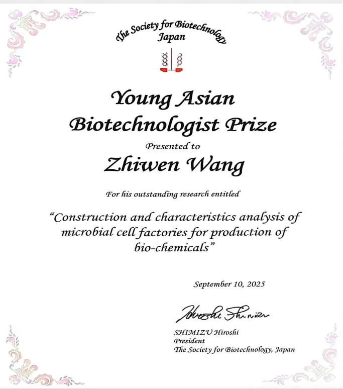 王智文教授赴日本,出席了第77届日本生物技术学会年会。凭借在生物技术领域的突出成果与创新贡献,王智文教授荣获2025年“亚洲生物技术青年科学家奖”。