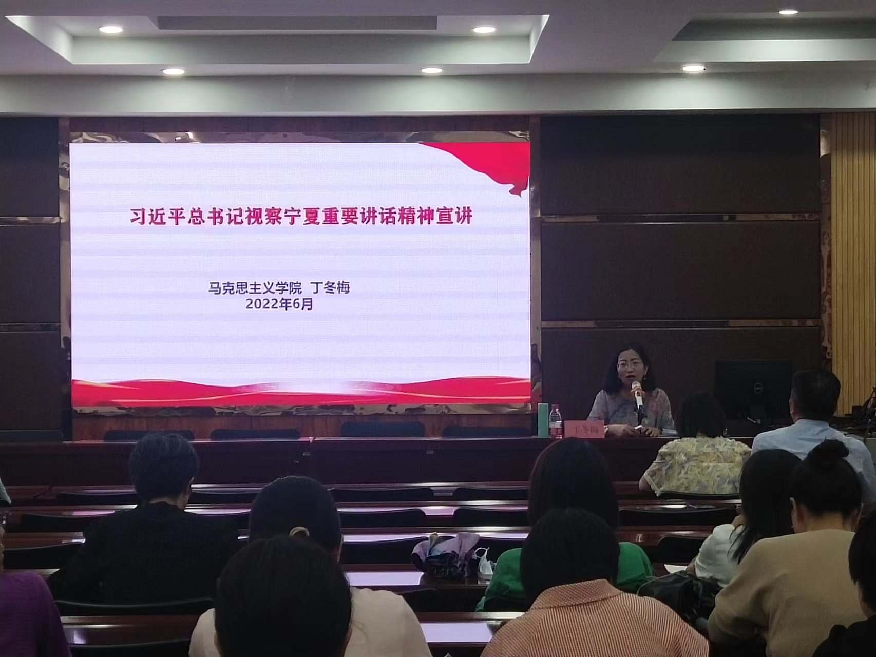 6月15日下午,学院于文萃校区知本楼报告厅举行习近平总书记视察宁夏重要讲话精神宣讲报告会,马克思主义学院丁冬梅教授应邀进行主题宣讲,报告会由党委副书记李文华主持,学院全体教职工参加。