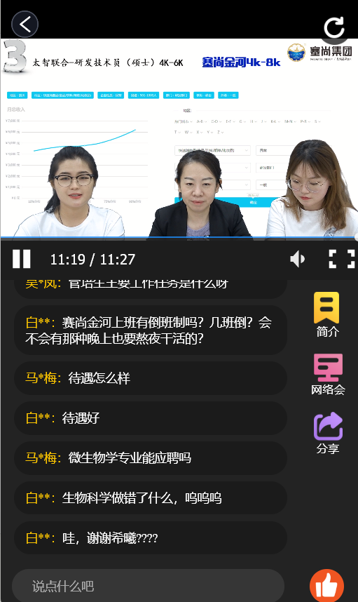 和农学院、食品与葡萄酒学院、化学化工学及新华学院毕业生围观,先后有204人线上求职,投递简历277份,线上完成303次面试,有31人与用人单位达成求职意向。直播结束后,毕业生可继续利用猫头英云人才市场线上求职、投递简历,与用人单位“屏对屏”的进行双选洽谈,推进就业服务工作。