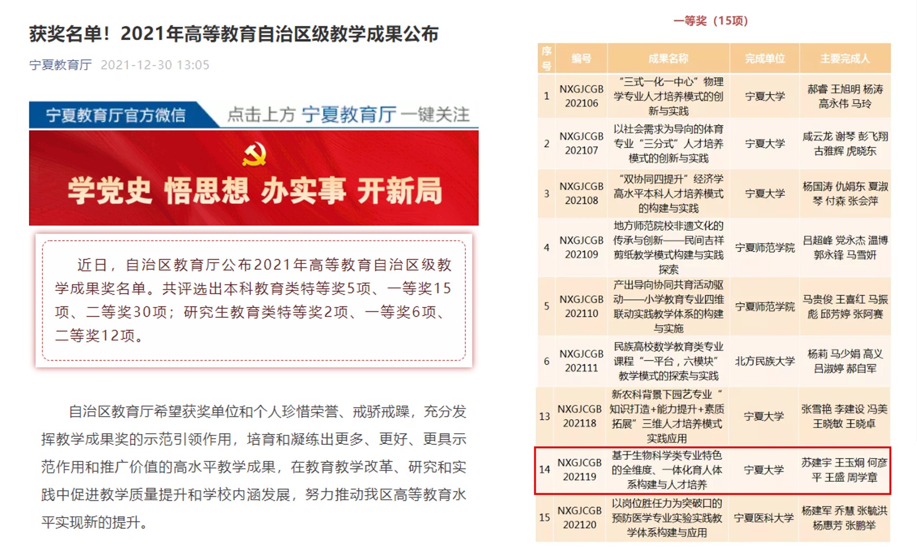 由苏建宇、王玉炯、何彦平、王盛、周学章等五人完成的“基于生物科学类专业特色的全维度、一体化育人体系构建与人才培养”项目荣获一等奖。