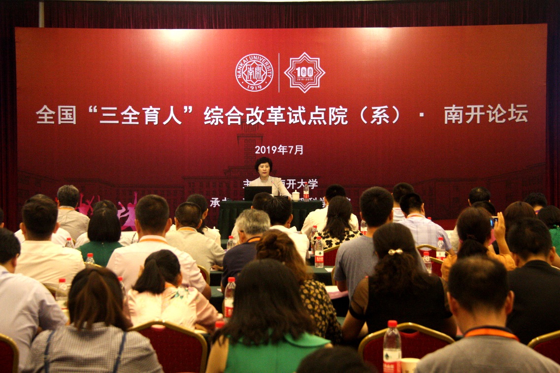 随后南开大学党委副书记、副校长杨克欣致辞并作了题为“传承百年爱国传统厚植爱国主义情怀”的报告,她介绍了南开如何将爱国主义教育融入育人模式的做法,并讲到实施“三全育人”综合改革试点项目是教育部落实立德树人根本任务、培养社会主义建设 者和接班人的重要举措和有效路径。