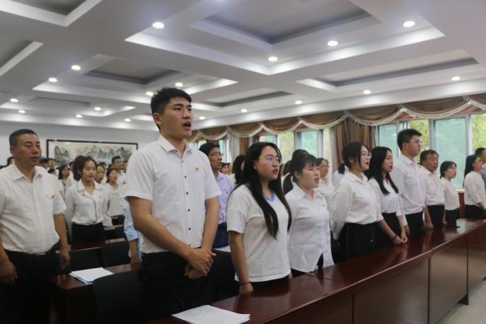 随后,全体党员及预备党员对着党旗进行了庄严的入党宣誓,重温入党誓词,并合唱了《没有共产党就没有新中国》。