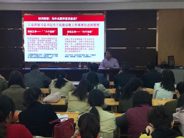 宣讲团成员、政法学院副院长、中国宗教学会理事、宁夏回族学会理事吕耀军教授作为本次讲座主讲人,为全院教职工做民族团结进步教育专题辅导。吕教授主要从认识民族团结进步的重大意义、准确把握民族宗教工作的精神实质、全面并深度解读自治区党委十二届四次全会精神三个方面进行了讲解。宣讲内容理论与实际紧密结合,内容丰富,信息量大,生动而又不失深度。