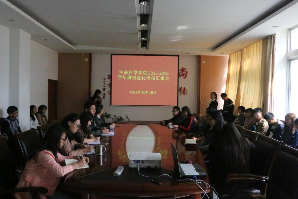 于10月19日下午举行了2015-2016学年班级量化考核汇报会。院党委副书记何彦平,副院长苏建宇,院团委书记高媛,辅导员杨亚珺,本科教学秘书王玲霞以及各班班长、团支书参加了此次会议。
