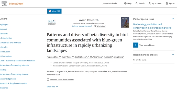 为第一研究单位,张大治教授为通讯作者,发表于国际鸟类学领域期刊Avian Research(中国科学院分区:一区TOP,论文链接://doi.org/10.1016/j.avrs.2025.100316)。本次会议上博士研究生袁鹏也通过壁报交流等形式展示了最新科研进展。