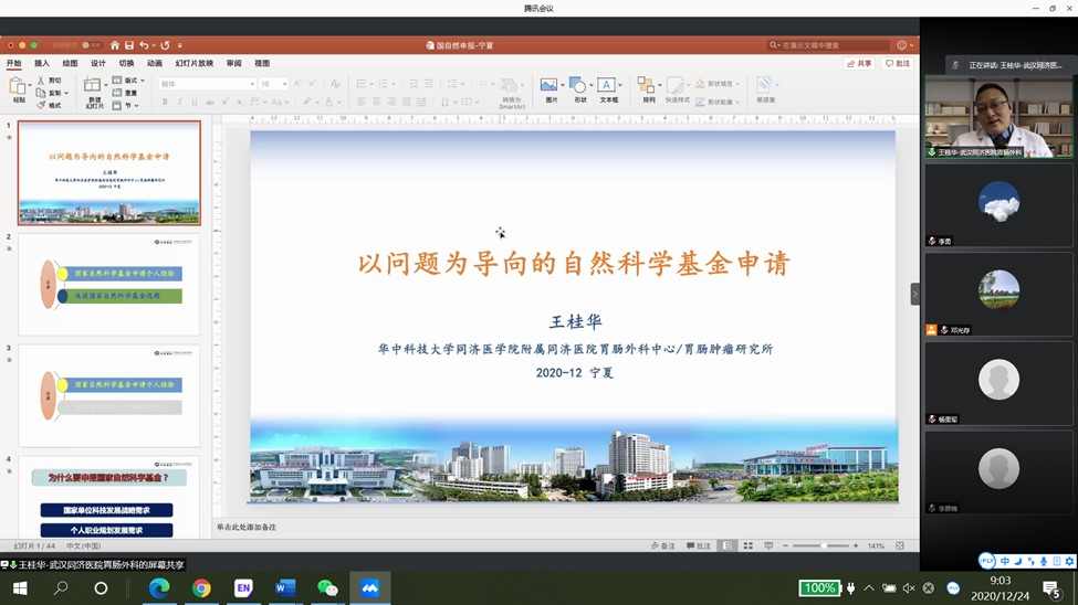 邀请了华中科技大学同济医学院附属同济医院胃肠外科中心医学博士、国家自然科学基金优秀青年基金获得者王桂华教授在线作了“以问题为导向的自然科学基金申请”专题报告会。王桂华教授结合自己的申报和评审经验,从国基金申报的总体策略和具体细节两个层面、从申请人和评审专家两个角度详细讲解了国基金申报中的一些共性问题和个性问题,提出了一些针对性很强的建议,并对老师们提出的问题进行了耐心解答。相信通过本次报告会,对于剧情色情片