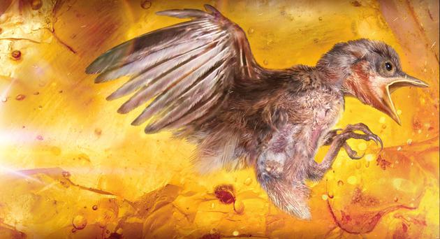 全球首见!琥珀中首次发现雏鸟化石 金黄鸟足醒目